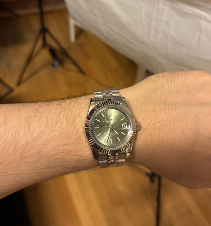 Discover the Seiko Mod Day-Date Mint Green, a meticulously crafted 8285 Automatic Movement Watch, inspired by the iconic Day-Date design. This elegant timepiece features a Mint Green aftermarket dial, encased in a 40 mm fluted bezel, offering a blend of style and precision for watch enthusiasts.
