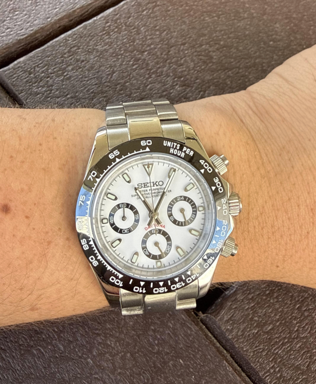 I just got my Seiko Daytona mod in yesterday, EXACTLY as ordered! After having a problem with another vendor sending me a completely different Seiko Daytona (different sub-dials), this one is precisely what I wanted/ordered/received. It took a bit longer than anticipated, but given the weather issues, I can't hold them responsible. I immediately put it on an alligator Bund strap (ala Paul Newman); even the lume is decent.