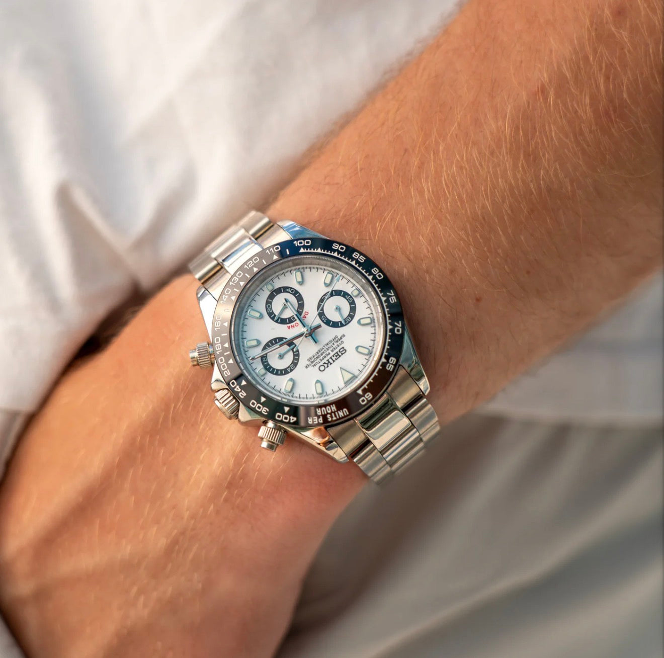I just got my Seiko Daytona mod in yesterday, EXACTLY as ordered! After having a problem with another vendor sending me a completely different Seiko Daytona (different sub-dials), this one is precisely what I wanted/ordered/received. It took a bit longer than anticipated, but given the weather issues, I can't hold them responsible. I immediately put it on an alligator Bund strap (ala Paul Newman); even the lume is decent.
